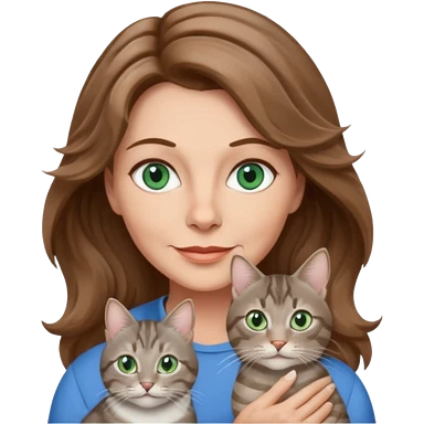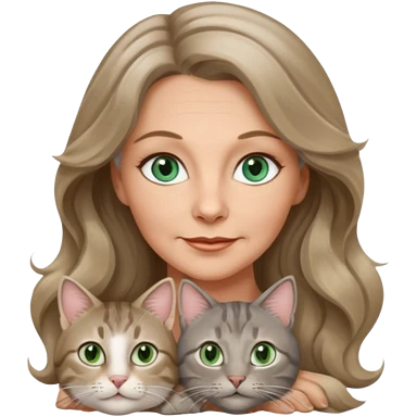 beautiful 50 yr old woman, long wavy dark blonde hair, blue green eyes with one beautiful gray tabby cat with hazel eyes emoji