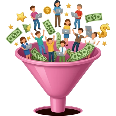 pink funnel overflowing at the top with people, laptops, stars, and money signs with nothing coming out of the bottom emoji