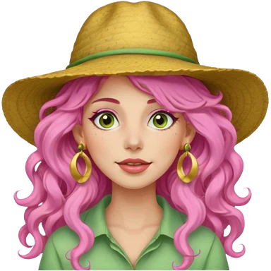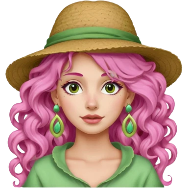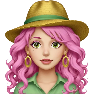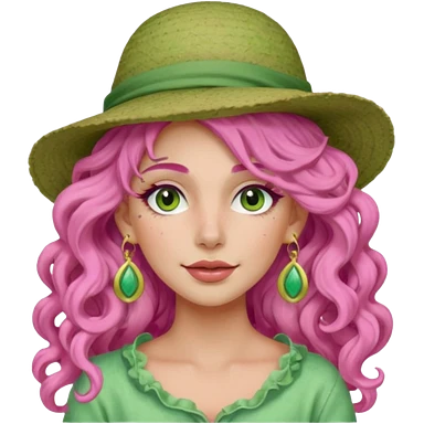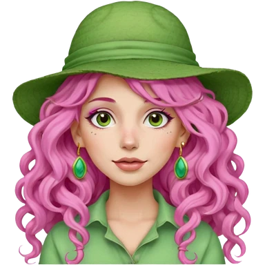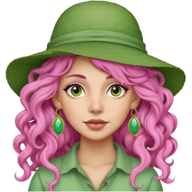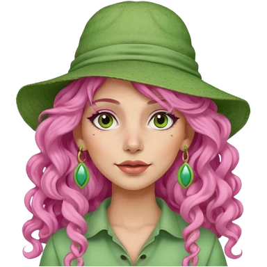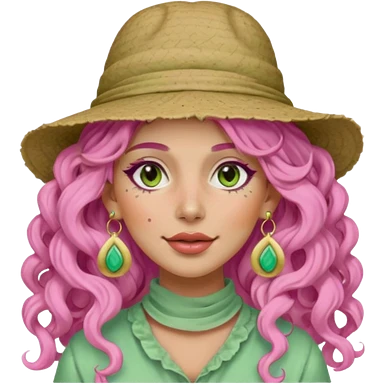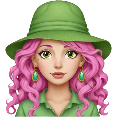 pink haired very long curly haired woman with full full face light green clay mask and big earrings and hat emoji