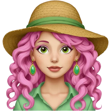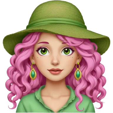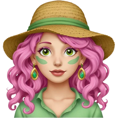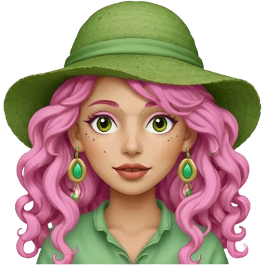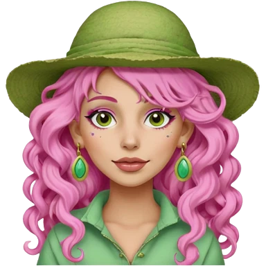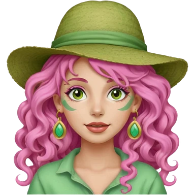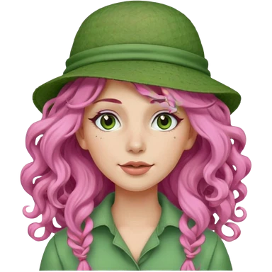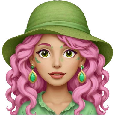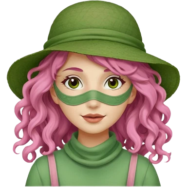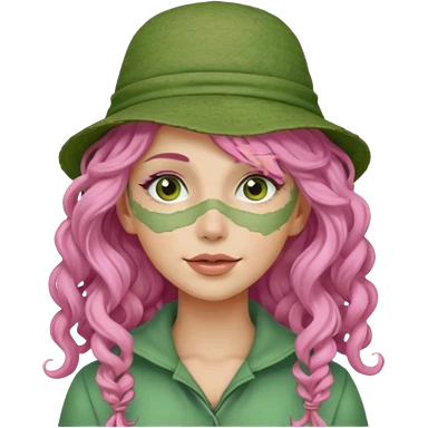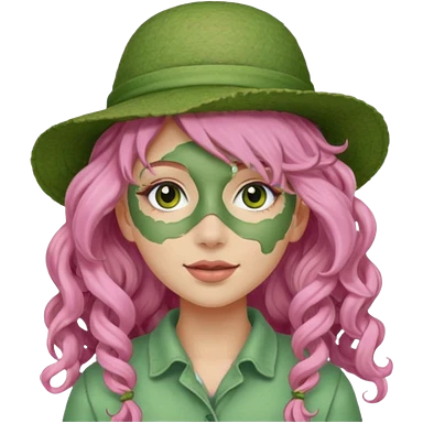 pink haired very long curly haired woman with full full face green clay mask and a hat emoji