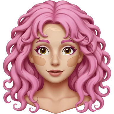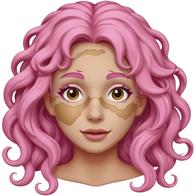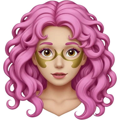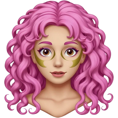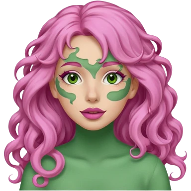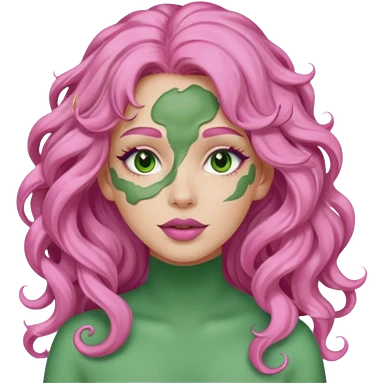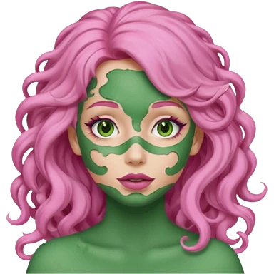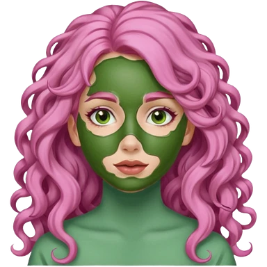 pink haired very long curly haired woman with full full face green clay mask emoji
