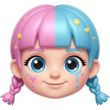 cute glossy emoji, pastel pink and blue split hair with braids, big shiny eyes, soft round face, kawaii style, bubblegum aesthetic, small hearts and stars, dripping paint effect, dreamy but slightly confident expression, sticker style, smooth shading, pastel colors, transparent background emoji