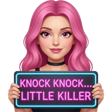 sexy girl with long pink hair and pink eyes wearing a holding a KNOCK KNOCK... LITTLE KILLER sign emoji
