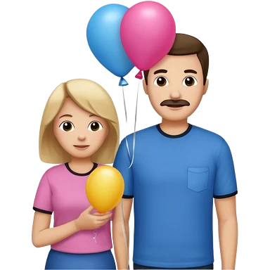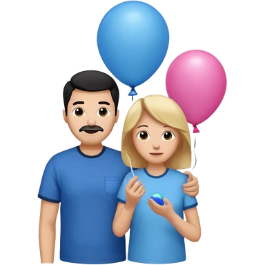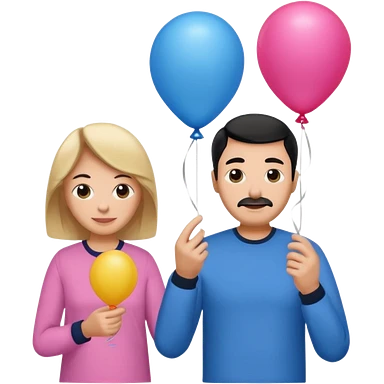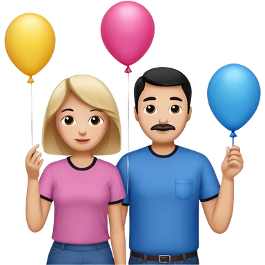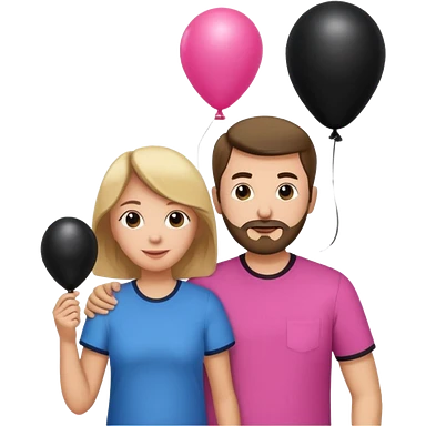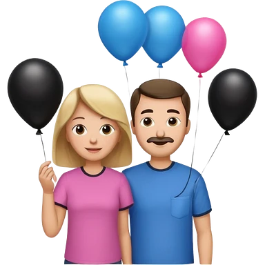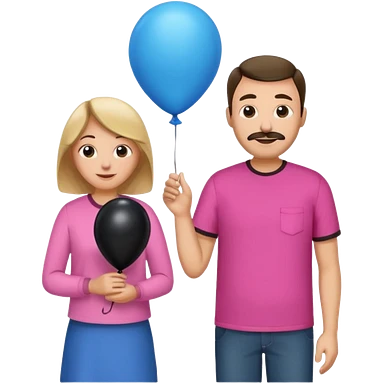 Mom in pink shirt dad in blue shirt holding black baloon emoji