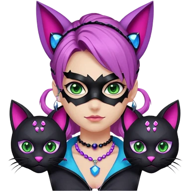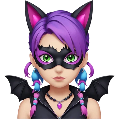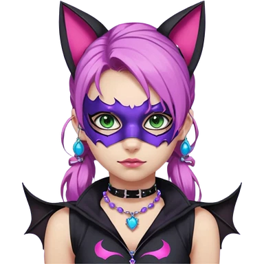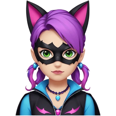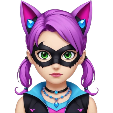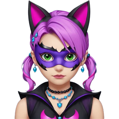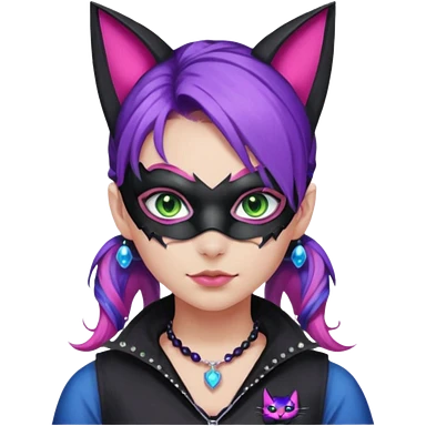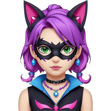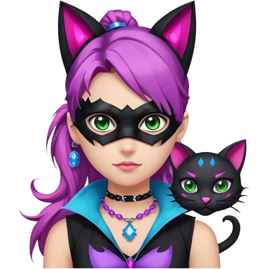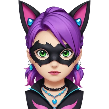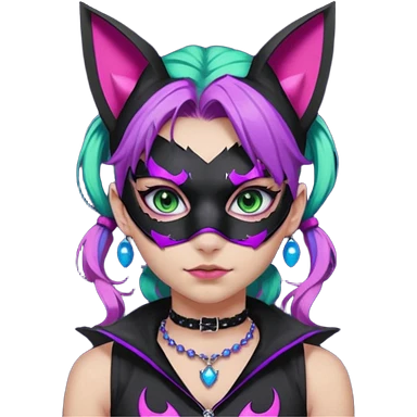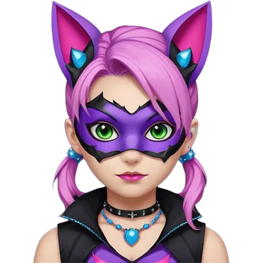 Girl with green eyes, wearing a bat mask with pink stones around her eyes, her hair tied in a ponytail, the hair is purple with blue and pink streaks, with black cat ears with pink stones around, wearing a black shirt that covers the neck, and a sleeveless blue jacket, and a necklace of pink stones emoji