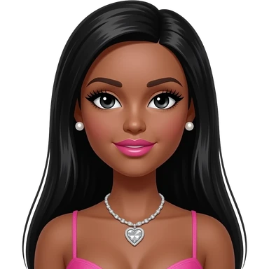 Pink bimbo lips, black doll eyes, dark brown skin, Long giant lashes,Doll faced shaped, silver Swarovski heart necklace, big Pearl earrings studs, bimbo, black doll eyes, barbie, darker brown skin with long curly black hair,, big breast no bra emoji | AI Emoji Generator