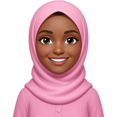 Indigenous, Muslim woman, black skin, wearing a ,Nation Of Islam styled Head scarf, i( this style is very specific it has no wrap around the neck) in Bubble gum pink, she is wearing a modest blouse with a mandarin collar buttoned up she has a soft delightful smile emoji