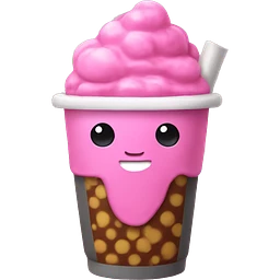 cup of boba tea with a soft pastel pink color, topped with creamy milk and filled with chewy black tapioca pearls. The drink has a smooth, sweet look emoji