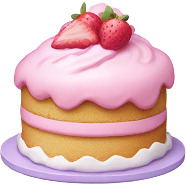 A pink strawberry shortcake that has 3 layers and is round with fluffy white icing emoji