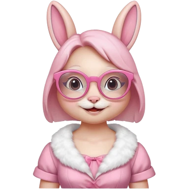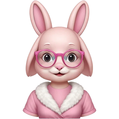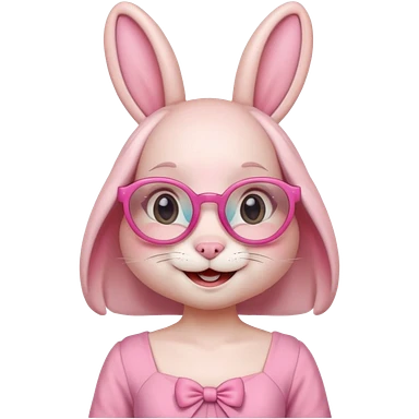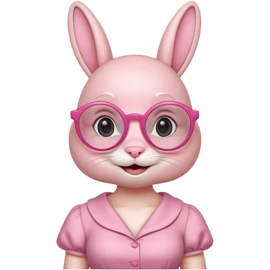 Pink bunny with big circular glasses, smiling, half body with dress emoji