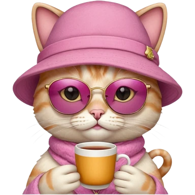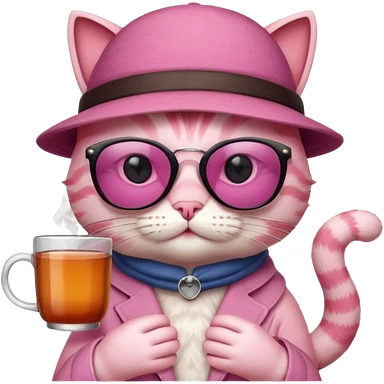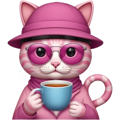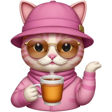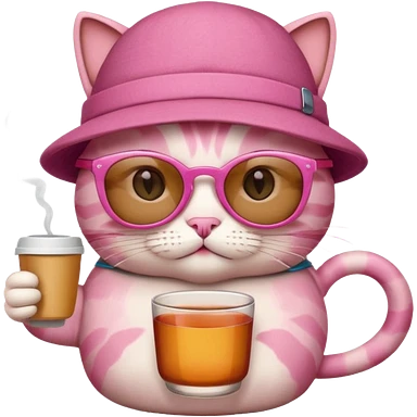 Pink cat with hat, holding cup of tea, wearing sunglasses emoji