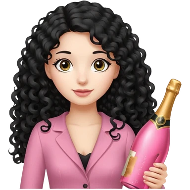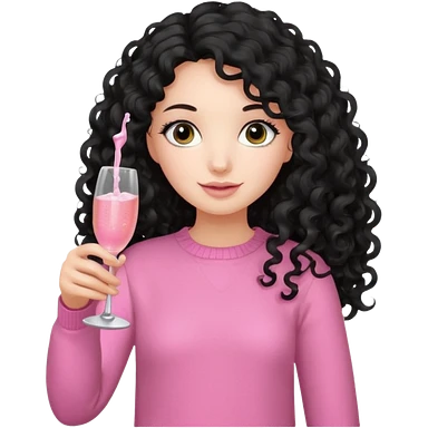 girl with long black curly hair, pink sweater and grey eyes with bottle of pink champagne emoji