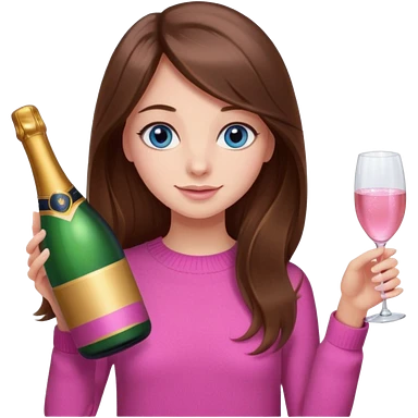 girl with long brown hair, pink sweater and blue eyes with bottle of pink champagne emoji
