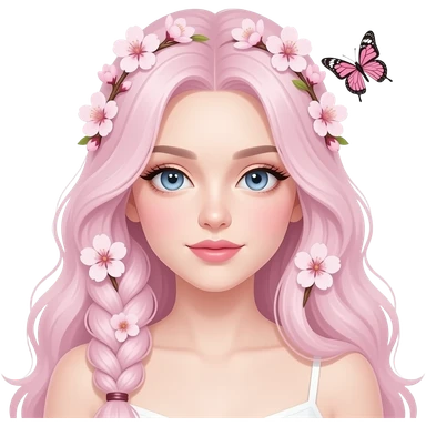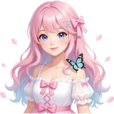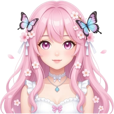 A Gorgeous Beautiful Anime Lady Sakura Cherry Blossom and Pretty Hair, pastelcore aesthetic, pastel pink and white, butterfly, Fairycore emoji