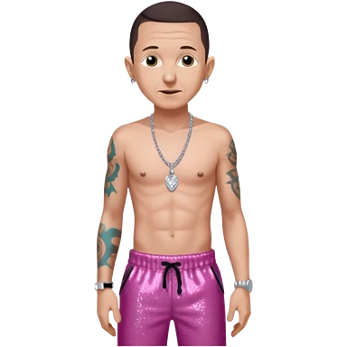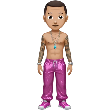 Chester Bennington with dark brown hair, dark pink sequin baggy pants, shirtless with necklace emoji