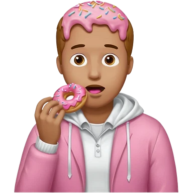 A man eating a pink donut spilling white icing down his face and clothes emoji