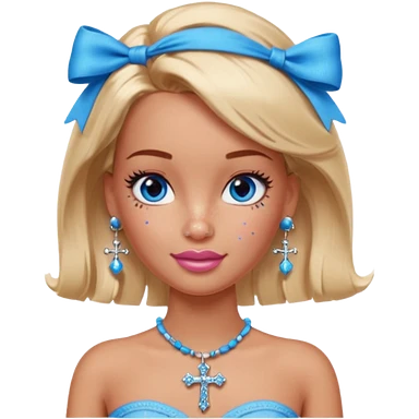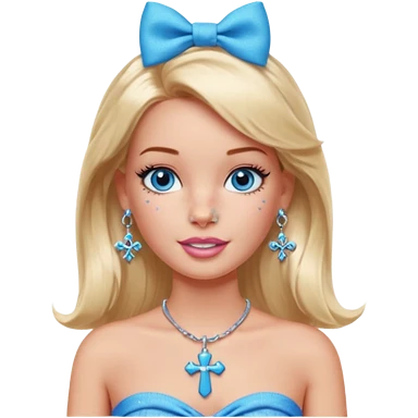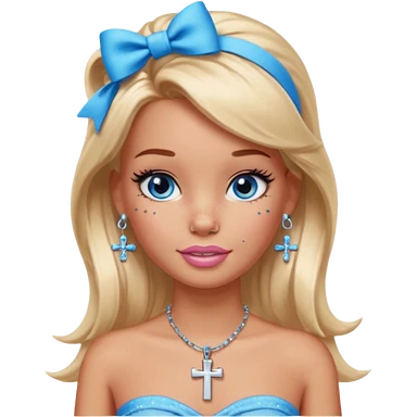 Barbie emoji with earrings and nose piercings and a cross necklace and blue eyes with bow in hair and tube top and long lashes with freckles emoji