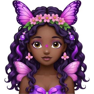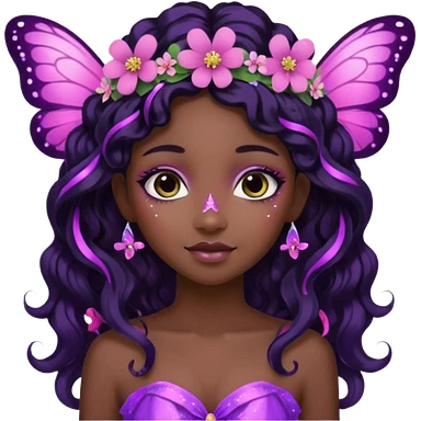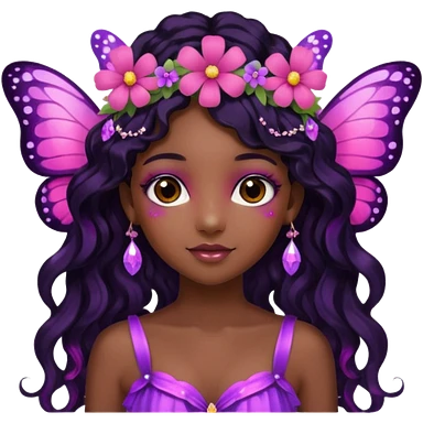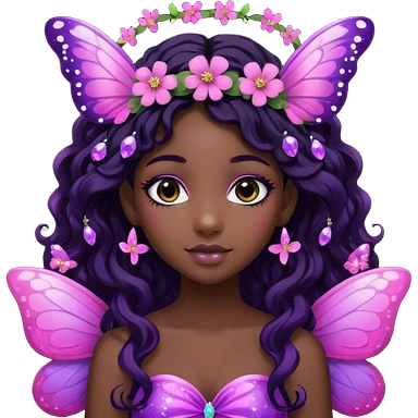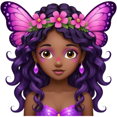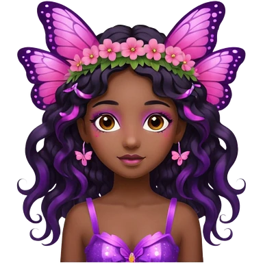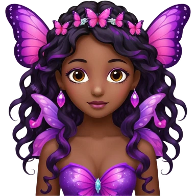 Black girl fairy with long wavy black hair, pink and purplered butterfly wings sparkly emoji