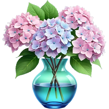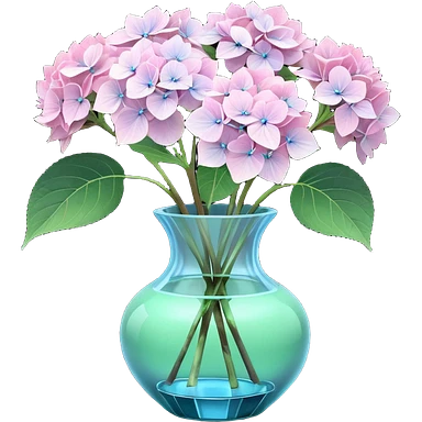 Hyperrealistic, 3D rendering, still life, smooth, clean thin lines, 8k, very Lush pale pink Hydrangeas with vivid leaves in pale blue crystal translucent glass vase, on dark wood stained table emoji