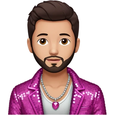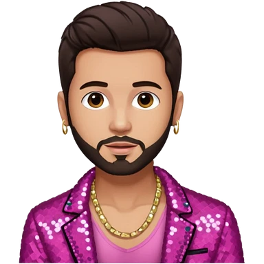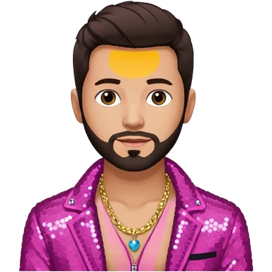 Frankie Zulferino, Pop Singer (b.1990) with dark brown hair and short beard, dark pink sequin jacket, light tan skin, shirtless with necklace emoji