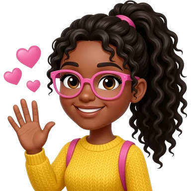 A curvy black pale light skinned woman with long curly hair in a high ponytail, with pink glasses, wearing a yellow sweater, waving at the camera, with hearts in the background emoji