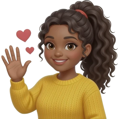 A curvy black pale light skinned woman with long curly hair in a high ponytail, wearing a yellow sweater, waving at the camera, with hearts in the background emoji