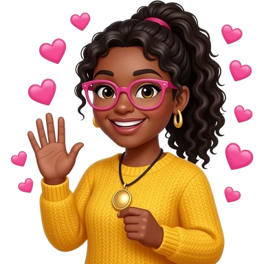 A curvy black pale light skinned woman with long curly hair in a high ponytail, with pink glasses, wearing a yellow sweater and gold locket, waving at the camera, with hearts in the background emoji