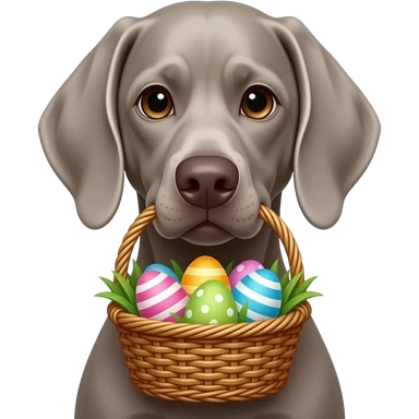 Gray Weimeraner as the Easter bunny holding Easter basket in mouth emoji