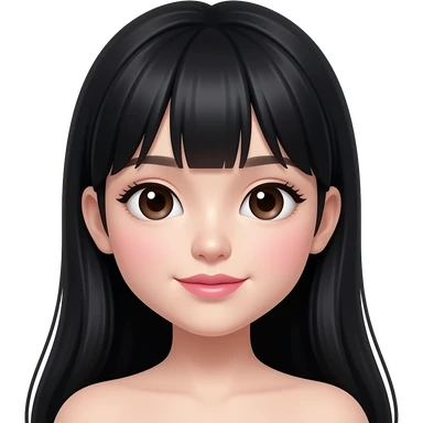 A cute, ethereal Asian doll-looking girl with long thick shiny black hair, dark brown almond-shaped eyes, very fair skin, a small straight nose, thin bright pink heart-shaped lips, cheekbones, and a mole on the right nose bridge near the eye.don't add bangs but baby hairs emoji