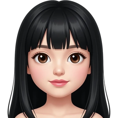 A cute, ethereal Asian doll-looking girl with long thick shiny black hair, dark brown almond-shaped eyes, very fair skin, a small straight nose, thin bright pink heart-shaped lips, cheekbones, and a mole on the right nose bridge near the eye. emoji