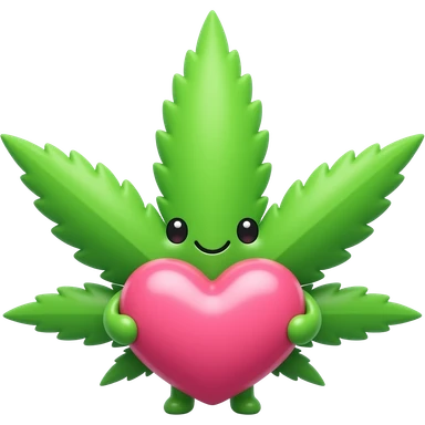 emoji of a kamoji kawaii weed leaf with a cute face holding a big heart emoji