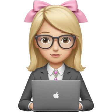 Please take the girl with laptop emoji and make her glassess light brown, her eyes ocean blue and her nose a bit smaller and pointier and she has blonde very long hair and a dark grey suit and pearls necklace, and has a laptop in fron of her and a tiny pink bow on the left side of her head emoji