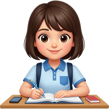 Beautiful girl with brown hair and brown eyes doing homework on a pink notebook and her ipad on her white table emoji