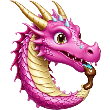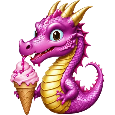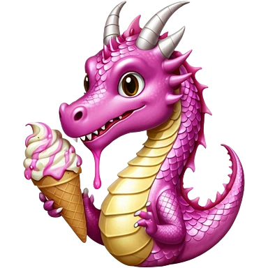 A dragon in pink tones with its wings, pink and golden legs, and shiny glitter, eats a vanilla and chocolate ice cream. emoji