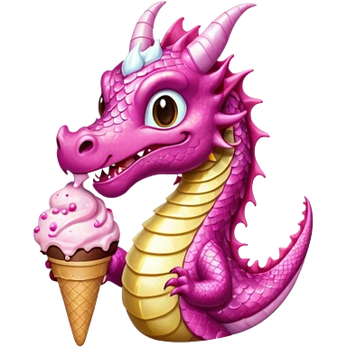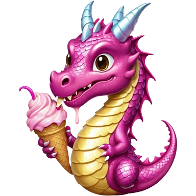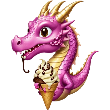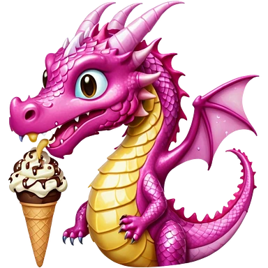 A shiny, glittery dragon in pink tones eats vanilla and chocolate ice cream emoji