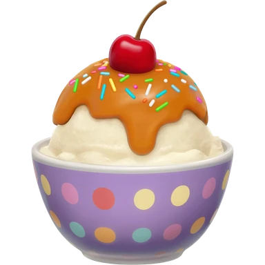 Hyperrealistic ice-cream sundae with caramel sauce, colorful and sparkly sprinkles, with a cherry on top, in a plauful patterrned bowl, extremely detailed, high quality, isolated, 3D rendering, 8k hd, 600 dpi. No emoji icons, no emoji faces, no human figures emoji