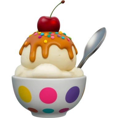 Hyperrealistic ice-cream sundae with caramel sauce, colorful and sparkly sprinkles, with a cherry on top, in a plauful patterrned bowl and silver spoon, extremely detailed, high quality, isolated, 3D rendering, 8k hd, 600 dpi. No emoji icons, no emoji faces, no human figures emoji