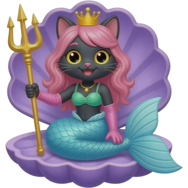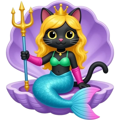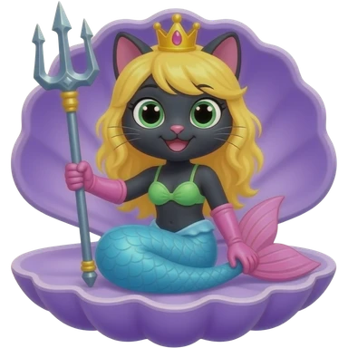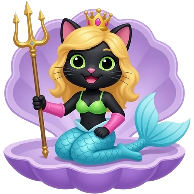 black anthro cat happy light blue mermaid tail with pink fins and long pink gloves yellow hair crown green swimsuit sitting on an open purple clam holding a trident artistic creation, beautiful art cartoon style art kawaii style art clipart art emoji