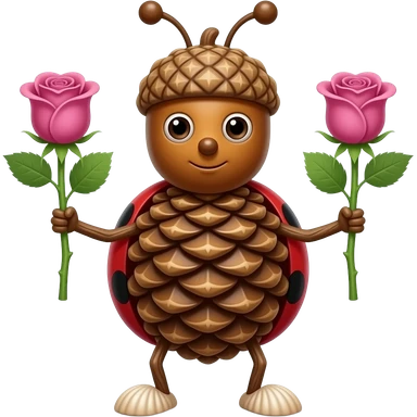 acorn for a head two seeds for the eyes a ladybug for a nose a twig for a mouth a pinecone for a body two pink rose on stems for the arms two sticks for the legs and two seashells for the feet emoji