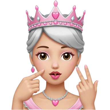 Middle finger flipping off with a ring on it and silver and pink tiara on persons head and a kissy face with a pink heart emoji