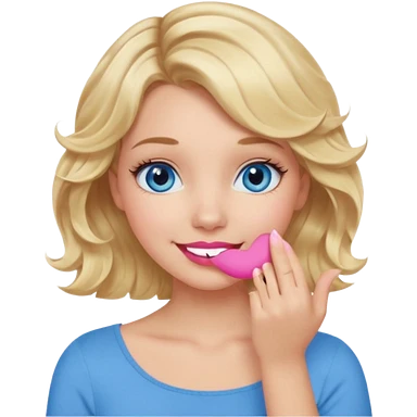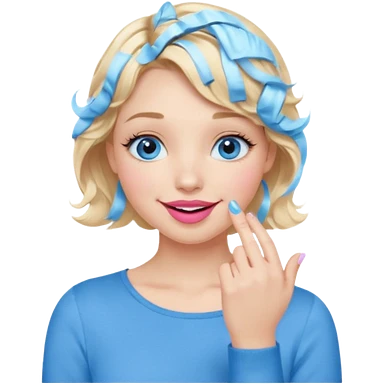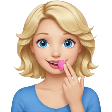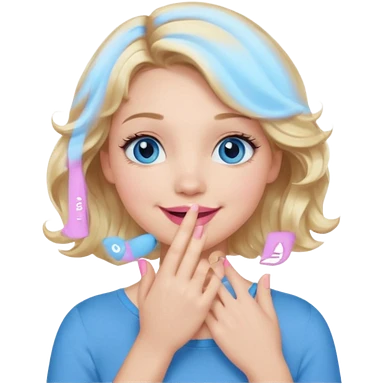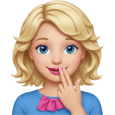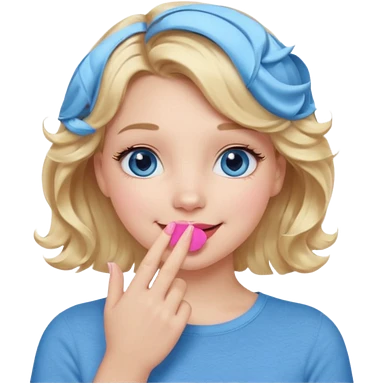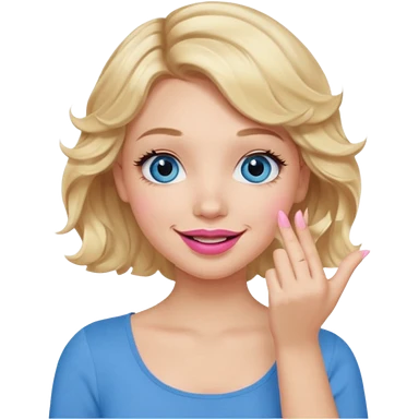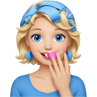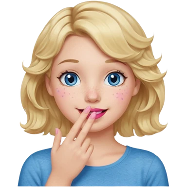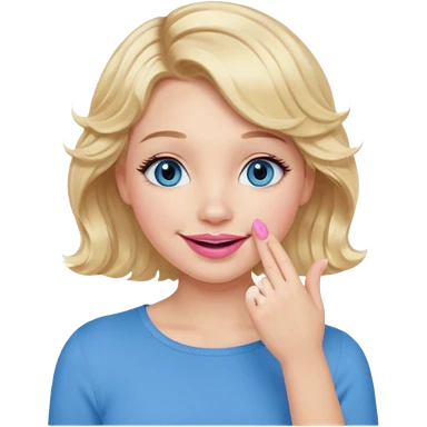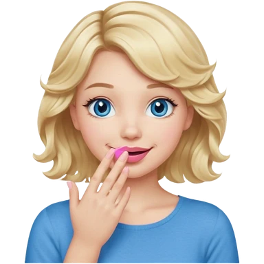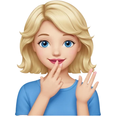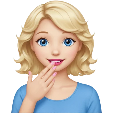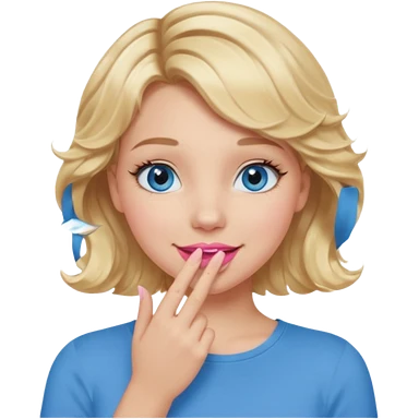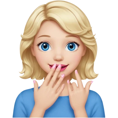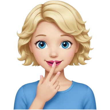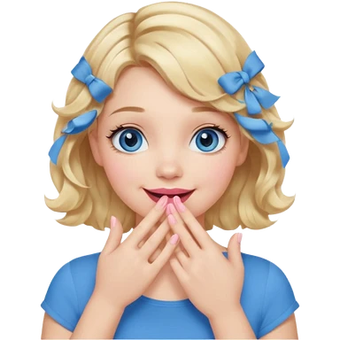 Girl Blonde short wavy hair, blue eyes, cute blue top, long lashes, pink lips, smiling, hand covering the mouth emoji