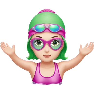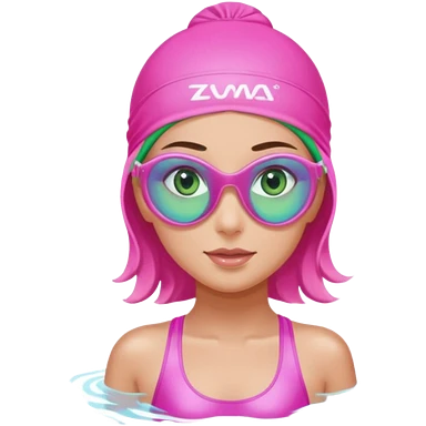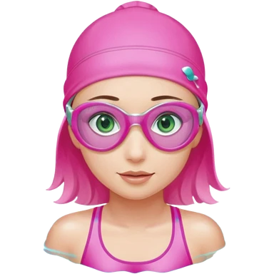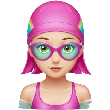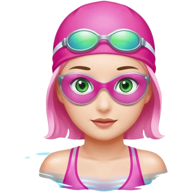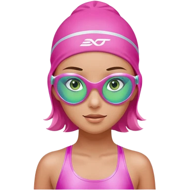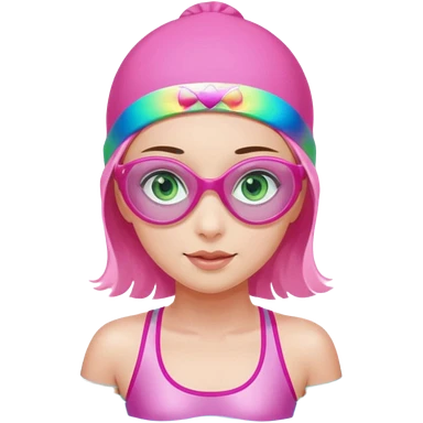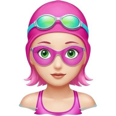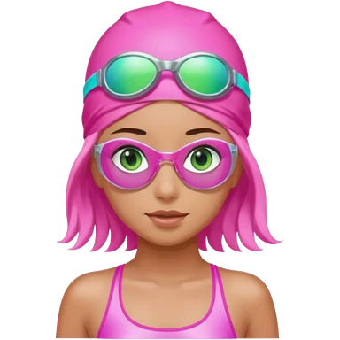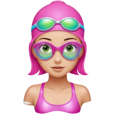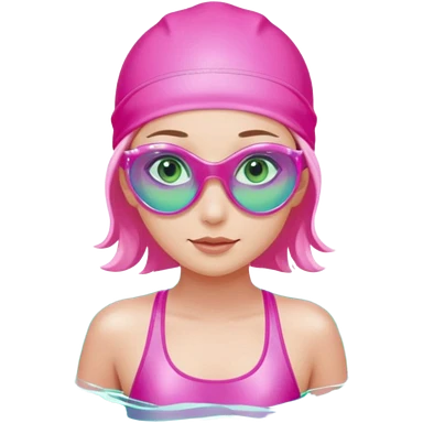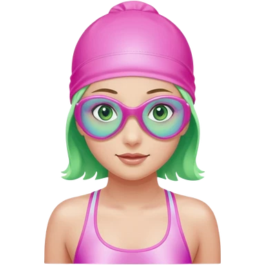 pretty girl with green eyes pink swim cap holographic swimming glasses and cute profesional swimmer pink swimsuit without her hair visible emoji