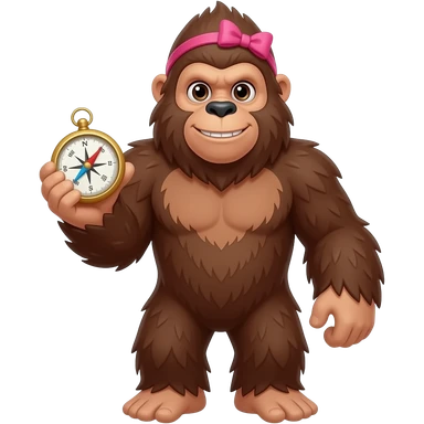 Full body walking sasquatch with pink bow in hair holding a compass in 1 hand and nothing in the other emoji