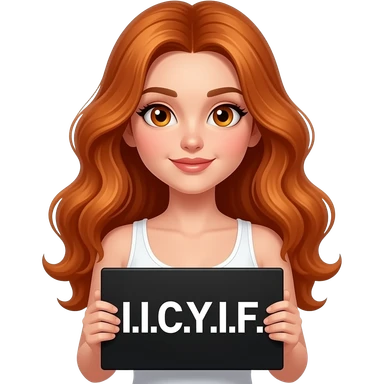 sexy girl with long wavy ginger hair and ginger eyes wearing a white tanktop is holding a black colored sign with I.I.C.Y.I.F.Y written on it emoji