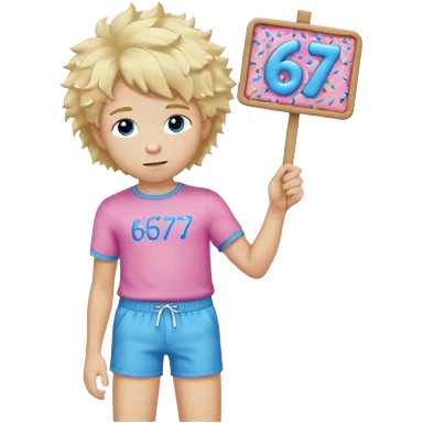 Teenage blond boy with fluffy hair, wearing pink shorts and blue sprinkles, holding a sign that says 67 emoji