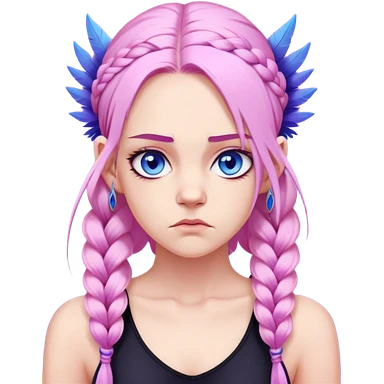 Long-pale-pastel-pink-hair with one braid on each side, grumpy expression, purple-pink feather-ear-cuffs in hair, black bodysuit, blue eyes, pink iris emoji