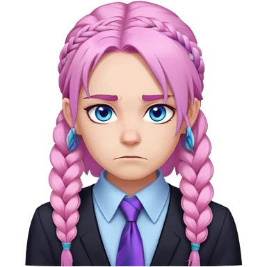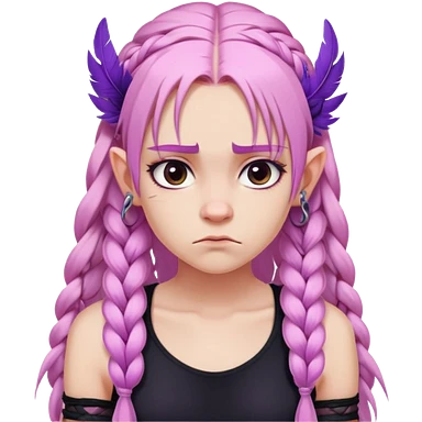 Gorgeous anime lady long-pale-pastel-pink-hair with one braid on each side, grumpy expression, purple-pink feather-ear-cuffs in hair, black bodysuit, blue eyes, pink iris, ethereal, fantasy, emoji