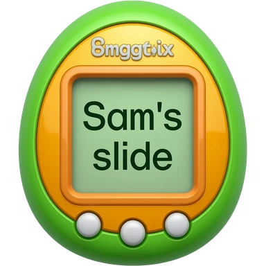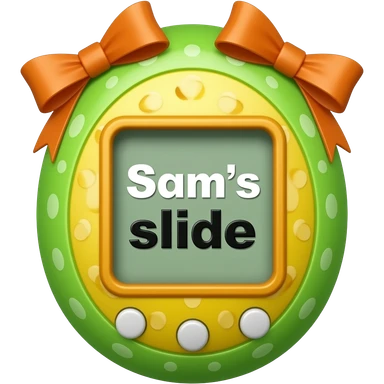 green and orange tamgotchi that says sam´s slide with bows emoji