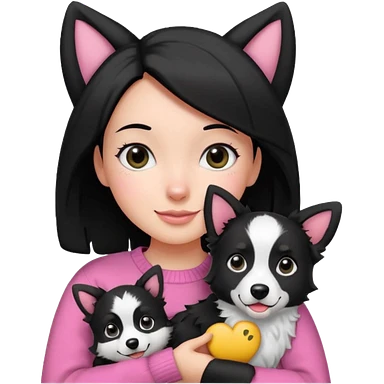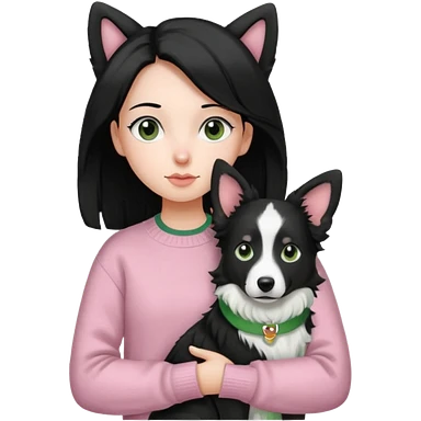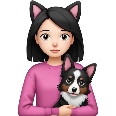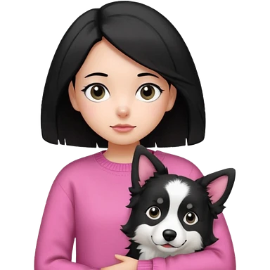 girl with side parted black hair shoulder length black eyes wearing pink sweater carrying black and white border collie with perked ears emoji style emoji