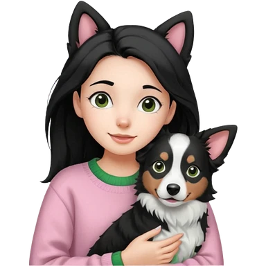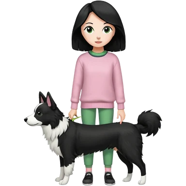 cheerful girl with side parted long black hair, wearing a light pink and green sweater, carrying a black and white border collie with perked ears emoji